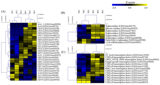 3.3. CAZyme Encoding Genes under Different Light Sources Mapped to the Differentially Expressed Genes (DEGs)