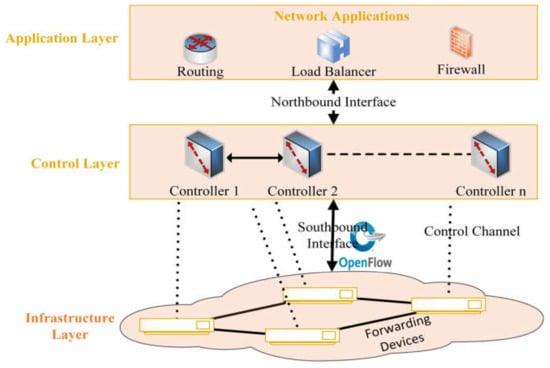 Software-defined networking (SDN) architecture is a promising solution to overcomes the limitations of traditional network architecture in terms of control, scalability, and management [1,2]. The basic idea of SDN is to separate the control plane from the data plane [3], where the control logic is extracted from network hardware and is centralized into an independent control plane. However, the process of separating the control plane from the data plane is not new, but it has limited to some applications such as NETCONF, SANE, and Ethane [4,5]. However, recently, this method of managing networks of various kinds has been introduced. The control plane can physically include a stand-alone SDN-Controller or multiple SDN-Controllers that collaborate among themselves and then act as a central SDN-Controller [6]. However, the standard process for separating SDN levels is illustrated in Figure 1.