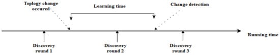 In most SDN-Controllers, each round of detections is performed approximately every 10 s and the SDN-Controller will become aware of new topology changes [44]. This is a very long process for dynamic network environments where the changes to the topology occur frequently over a short period [38]. This greatly affects the operation of network applications that depend entirely on the SDN-Controller’s network topology [78]. For example, if the learning time is long and there is a link failure on router links, the routing application will still redirect traffic on that path based on a legacy network topology, which means this will cause many packets to be dropped. Figure 7 shows the relationship between learning time and topology changes. When a topology change occurs after the first discovery round, the SDN-Controller will wait for the next round to re-detect changes to the topological structure, which is too long. On the other hand, there is a suggestion to reduce the interval of discovery changes, but this will cause the number of the Packet_Out messages to increase significantly, which in turn will increase the load on the SDN-Controller and uses more bandwidth in the process of discovering the topology. In addition, an increase in the discovery interval means fewer LLDP messages and less overhead, but also means more time required to learn about new changes.