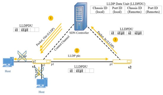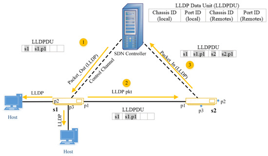 Moreover, the Packet_Out message has a field called instruction which is configured to forward the encapsulated LLDP out of the corresponding port on the SDN-Switch [39,42]. Next, the SDN-Switch (s1) will, in turn, receive Packet-Out messages, de-decompile the LLDP packet from the Packet-Out message, and forward only the LLDP packet that has exited from each matching port (based on the port’s MAC address in LLDPDU). When SDN-Switch (s2) receives an LLDP packet, it will parse the LLDP packet, write its SDN-Switch Chassis-ID, and add Port-ID (i.e., the port through which the SDN-Switch received the LLDP packet). Then, SDN-Switch (s2) will encapsulate the LLDP packet in a Packet_In message and send it to the SDN-Controller. The SDN-Controller will in turn parse the Packet_In message and discover the new links represented by the mapping between s1 and s2 [65]. However, the same method is repeated to discover the remaining links in the network [39].