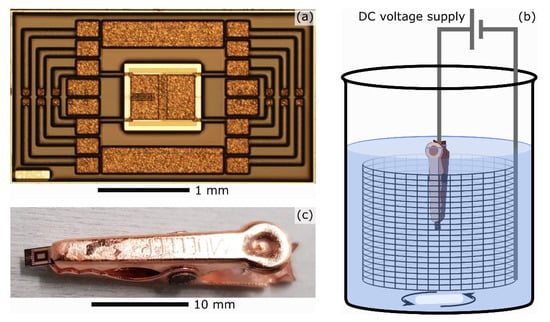 A schematic representation of the setup used for electropolishing (a 2-electrode setup) is shown in Figure 1b. This rather simple setup comprises a DC voltage supply, a beaker, in which the two electrodes are in electrical contact with each other via an electrolyte, and a magnetic stirring system. The specific electrolyte used is well-suited for electropolishing copper and is composed of 45 vol% orthophosphoric acid (concentration 85%), 45 vol% methanol, and 10 vol% isopropanol. For the electropolishing experiments presented in this work the poly-heater specimens were electrically contacted by an alligator clip, as shown in Figure 1c. To allow electropolishing of the central Cu plate without damaging it, the alligator clip was used to contact one of the measurement pads that are internally connected to the central plate. By using an alligator clip made of copper, no additional metal was introduced to the system, minimizing measurement errors due to the formation of a galvanic coupling and possible galvanic corrosion of the chip’s electropolished surface [,]. As depicted in Figure 1b, the alligator clip clamping the poly-heater to be electropolished is fully immersed into the electrolyte and acts as an anode. By this means, the contact surface between the anode and the electrolyte, determined by the electrically contacted Cu surface of the poly-heater (≈2 mm2) and the alligator clip (≈400 mm2), becomes large enough such that the resulting electrical currents can be measured, and reproducibility of the operating conditions can be guaranteed. A cylindrically shaped mesh grid made of stainless steel with height 42 mm and diameter 16 mm functions as a cathode. All experiments were performed at room temperature and with stirring of a frequency of 200 revolutions per minute.