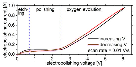 In addition to the electrode materials and the electrolyte, multiple parameters influence the electropolishing process. These comprise electrode distance, surface area ratio of the cathode with respect to the anode but also applied voltage (and corresponding current density), electropolishing duration, stirring, temperature, electrolyte bath age, etc. [,,,,,]. Yang et al. [] recommend to acquire a current-voltage curve to find the optimal electropolishing voltage for the particular setup and operating conditions in use. Such a curve characterizing the setup in the present publication is shown in Figure 2. Well in agreement with reports in literature [,,,,,], three different regimes can be identified: the first regime ranges from 0.0 V to roughly 0.7 V and is determined by an increasing current. In this regime, etching of the metal (preferentially at grain boundaries) occurs and for this reason no surface smoothing takes place [,]. The second regime (extending from 0.7 V to 2.5 V) is characterized by a constant current density and denotes the interval, in which the optimal voltage in terms of surface smoothing can usually be found [,,,]. In this regime, a viscous liquid layer is formed on the anode’s surface, where the continuously dissolving Cu is present at high concentrations in form of aqueous cupric salts. Their transport away from the anode’s surface is limited by diffusion processes that manifest in the constant current [,,]. The principle leading to surface smoothening can be explained, as follows. Projections of the anode’s surface protrude further into the viscous liquid layer than crevices and for this reason they reach out to regions with lower ionic concentrations. This causes a more effective dissolution and faster material removal of the projections, leading to a gradual levelling of the surface. The third regime corresponds to voltages of above 2.5 V, at which oxygen bubbles [,,] are formed at the anode’s surface disturbing the viscous layer. Bubbles that are trapped on the surface potentially result in the formation of severe etch pits [,,].