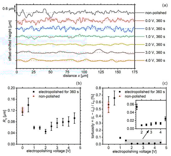 where = 175 µm is the before-mentioned projected length of the profile (see Figure 3a) and is the line integral of the profile. For both and tortuosity (Figure 3b,c) it can be seen that electropolishing at voltages of 0.0 V and 0.5 V clearly does not contribute to surface smoothing. By means of the parameter, one can argue that very good polishing results can be obtained for voltages between 1.0 V and 2.0 V and that for higher voltages the smoothing becomes less effective. The particular effect of micro levelling [] grain boundary grooves is very well explained by means of the tortuosity. A highly significant difference between the etched samples (0.0 V and 0.5 V) and the polished samples (>0.5 V) is observed. Especially for the samples polished in the oxygen evolution regime (≥2.5 V), it can be seen that micro levelling is still very effective (Figure 3a,c) and that the slight increase in tortuosity in this regime (inset image in Figure 3c) is attributed to pitting. In agreement with the evaluations, a global minimum of the tortuosity at 2.0 V can be found, denoting the optimal electropolishing voltage.