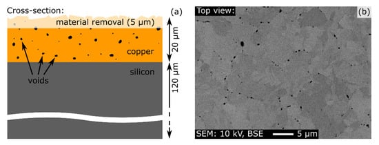 (a) Cross-sectional schematic illustration visualizing the procedure of accessing voids in the interior of a Cu metallization by material removal during electropolishing. (b) Top view SEM image of a thermo-mechanically stressed Cu metallization that has been prepared by electropolishing (2.0 V for 360 s, ≈5 µm material removal) for void analysis.