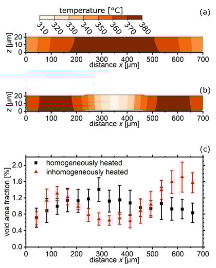 (a) Cross-sectional temperature distribution in the Cu layer of (a) a homogeneously heated and (b) an inhomogeneously heated poly-heater, simulated by finite element method []. (c) Profile of void area fraction along the lateral direction of the investigated poly-heaters’ Cu plate.