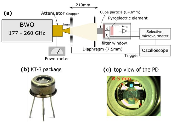 The basic scheme of the experimental setup is shown in Figure 1a, where a terahertz source based on a backward-wave oscillator [] (BWO) “OV-1” from Istok Co. was use to excite the detector. It was chosen because of its special features such as stability, relative high output power (6–15 mW), good wave-front quality and wavelength tunability between 177 and 260 GHz. A certified attenuator was coupled to the BWO and used to control and measure the emitted power. The horn antenna of BWO was placed at a distance of approximately 210 mm from the detector’s window (which corresponds to the far-field condition) to form a quasi-plane wavefront. A commercial Infrared PD (MG-33) was used for the detection of THz radiations (Figure 1b,c). The PD-MG33 sensor has a standard KT-3 package [], which contains a primary amplifier located on the sensor chip, as shown in Figure 1. The THz beam was modulated by a chopper at 20 Hz rate, and the photoresponse was measured by a micro-voltmeter as well as an oscilloscope. A dielectric wavelength-scaled particle in the form of a cube was glued and placed directly on the PD window made of germanium and with a thickness around 70 m. To increase the coupling efficiency of the PD with THz radiation source at = 1.5 mm (frequency of about 0.2 THz), we use a terajet formed by a polytetrafluoroethylene (PTFE) cube with a dimension equal to 2. The cubic shape of the dielectric particle was chosen because of the manufacturing simplicity and its attachment to the flat surface of the PD filter window. The refractive index of PTFE is n = 1.41 [,,], and the beam waist of the terajet (in the unit of full width at half maximum) for the dimension of the PTFE cube is about 0.5 [,,,]. The maximum field intensity enhancement was observed at the distance of about 0.7 mm from the shadow surface of the cuboid [,,,]—see Figure 1c, taking into account the features of the constructive assembly of the PD shown in Figure 1a (minimal distance between window’s shadow surface and sensitive element is not equal to zero and has a fixed value (d), fixed by the manufacturer technology).
