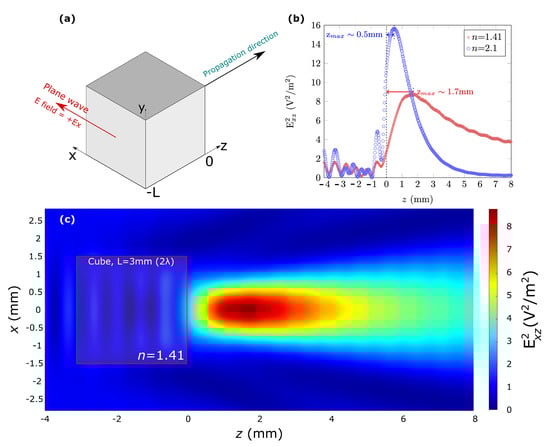 (a) Sketch description of the cube with the plane wave and the propagation directtion used in the simulations, (b) Electric field intensity along the direction versus the z direction for the case of two refractive index ( and 2.1) and (c) the terajet formation from the cube with 2-wavelength dimensions by the finite integral technique realized in commercial software—the CST Microwave Studio.