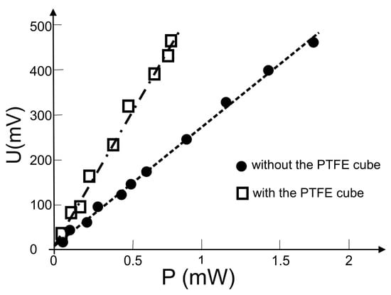 The detection measurements were performed with and without the cube particle with different emitted power. The measurements (Figure 3) show a linear dependence of the voltage (U) with the power at = 1.5 mm (this value gives the maximum output power from the BWO). The method for measuring the NEP was similar to that described in Reference []. The idea of this configuration is to exploit a dielectric PTFE particle that has a wavelength-scale size to concentrate the radiating THz waves into the sensitive area of PD with a diffraction-limited value. This allows increasing the intensity of signal to be measured, such that the signal-to-noise ratio (SNR) can be improved.