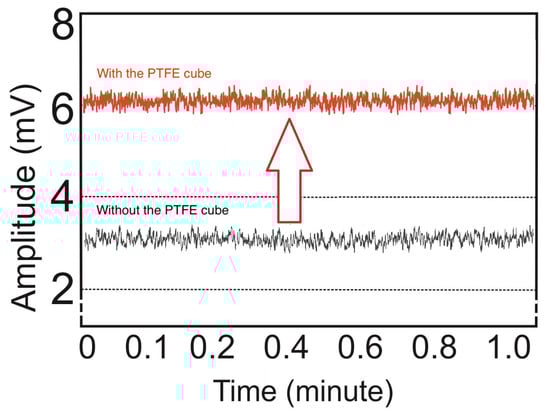 Figure 4 shows the measured photoresponse without the cube (black) and with the cube (red). To demonstrate the sensitivity enhancement, the detector was excited by the source at its lowest power idem when the signal from the receiver (without a particle) was at the noise level. Then, we placed the particle and looked at the increase in the signal and the noise level. The measured amplitude with the cube was 6.1 ± 0.06 mV, which was 5.6 dB higher than that without the enhancer. The standard error was calculated from eight distinct measurements and a Student’s (t) coefficient [] of 2.132, corresponding to a 90% two-sided confidence interval. The standard deviations of the amplitude were measured for the cases without and with the PTFE particle, respectively. These results indicate that the proposed technique can enhance the detected THz intensity of 5.6 dB at 0.2 THz for MG-33 PD. Similar results were obtained for the MG-30 sensor, which has the same internal design as the MG-33 but differs only in standard 1203.15-1 package. The obtained gain is below the theoretical one because of the uncertainties in the setup such the dimension of the active area of the PD, and the distance from the optical window to the active element of the PD was fixed by the manufacturer and unknown. Furthermore, we did not verify the refractive index of particle material experimentally. From a practical point of view, it is quite difficult to perform a precise relative positioning between the cuboid and detector to ensure that the detector is located just at the point of maximum electric field generated by the cuboid. However, knowing the gain obtained experimentally, we can obtain an estimate of the real distance between the cuboid and the detector by looking at Figure 2b.