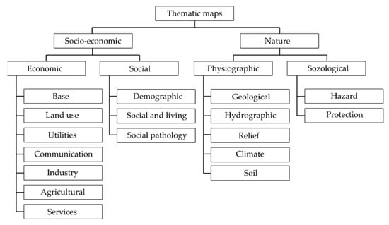 Generally, maps differ in both the content and component parts. Simple maps consist of several elements, while more complex maps (e.g., topographical) contain more elements. Every map is a set of strictly defined graphical elements. Some of the signs are subordinated to cartographic rules and depict some real world objects. Other elements of the map are not cartographic and are thus subject to different rules or do not represent any real life objects. Ref. [] mentions an example of the map title and legend. Those descriptive elements are controlled by natural language rules, and their location on the map is controlled by aesthetic rules of the map creator. Thematic maps belong to the group of geographical maps. Friendly [] states that they are effective in discovering and exploring spatial data. The theme is related to the chosen phenomena (e.g., economic, demographical or cultural). According to Slocum et al. [] and Tyner [], in many cases thematic maps are defined by the special technique used for the map’s creation. Those techniques are, among others, dot and flow maps, diagrams, proportional symbols or isolines []. Subjects related to the preparation, development and production of thematic maps are well addressed in global literature [,]. The division of thematic maps, according to their purpose, is shown in Figure 1.