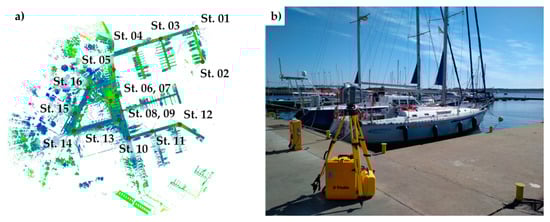 The terrestrial laser scanning method was used to obtain spatial data about the land objects of the marina of the NSC and objects on the water surface. The three-dimensional representation of infrastructural elements supplemented the bathymetric data. The instrument used, the Trimble TX8 scanner, was equipped with an optical module that enabled picture-taking of the environment and a designation of a color to individual measured points at the stage of data processing. 16 scanner stations were established in the marina area (Figure 3). For each point from the point cloud, the horizontal and vertical angles and the distance between the target and the device were measured. Based on the obtained observations, the coordinates of individual points in the local coordinate system of the station were calculated. It is worth noting that each measuring station had a separate coordinate system with an origin point in the laser emission and reception center. The planar orientation of the coordinate system resulted from the method (direction) of mounting the instrument on a tripod.
