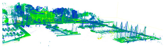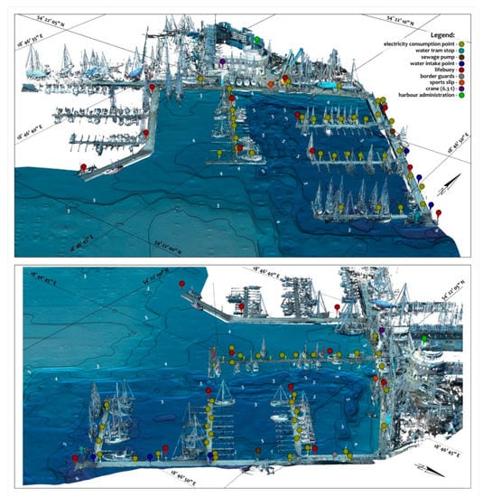 Each of the scans registered at the stations had a local coordinate system. To create a uniform point cloud for the entire marina, one of the local systems was adopted as the global system for all the point clouds. To perform this operation, it was necessary to replicate the same elements of the real world in the three-dimensional space of adjacent point clouds. The transformation control points were the coordinates of the centers of spherical markers (polystyrene spheres) located in the marina, ensuring optimal visibility from the measurement stations. Coordinates of points (centers of spheres) in local coordinate systems of the stations were used to determine the transformation parameters of every point cloud. The effect of the registration (connection) of point clouds was a coherent and geometrically correct set of spatial data representing the measured object. Registration error of 16-point clouds did not exceed 1 cm. The resulting spatial data set was a numerical representation of the marina technical infrastructure (Figure 4).