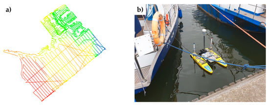 The second equally important spatial data set were bathymetric observations recorded by a single-beam echosounder SonarMite mounted on an unmanned surface vessel. Depth readings received a spatial and temporal assignment based on the positioning results of the Trimble R10 GNSS receiver. Satellite measurements carried out by the receiver were performed in the GNSS RTK differential mode using the VRSNet.pl active geodetic network. Bathymetric measurements were carried out in both manual and automatic mode, including setting the drone to follow given profiles. The method of manual navigation of the USV was used in the case of narrow and hard-to-reach areas of the marina basin. Bathymetric data recording locations are shown in Figure 5.