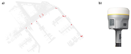 Characteristic control points of the marina quay (a) measured by the GNSS RTK method with the Trimble R10 receiver (b) (source: www.geotronics.com.pl accessed on 4 May 2020).