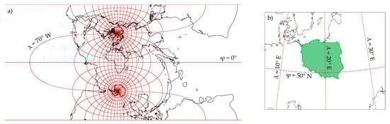 The purpose of using cartographic projections and creating maps is to present a convex surface approximating to the shape of the Earth (sphere or rotational ellipsoid) on a flat two-dimensional surface []. The mapping functions enable the transition from angular coordinates of longitude and latitude to orthogonal coordinates on the plane []. Attributes containing selected spatial information such as the course of borders, height in the adopted reference system, or the manner of land use are assigned to the planar coordinates []. A key feature of cartographic mapping is the mutual assignment of points on the Earth’s surface and the map’s surface []. As a result, a unique assignment of each point on the surface of the original to exactly one point on the surface of the image is obtained []. An inherent feature of all mapping is the occurrence of mapping distortions. Hence, when creating maps, the available projections are analyzed and the mapping is carefully selected, which in turn represents the desired region of the Earth in the least disturbed manner [,].