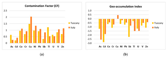 Contamination factor (a) and Geo-accumulation Index (b) of PTEs (average values) in the AdV cultivation soils in the Valdichiana area, calculated using their background levels in soils of Southern Tuscany [22,23] and Italy [24].