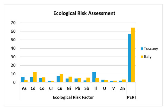 According to soil concentrations of PTEs, the Ecological Risk Factor (ERF) and the Potential Ecological Risk Index (PERI) for the Valdichiana soils had average values below their respective lowest thresholds of 40 and 65 (Table 2; Figure 2), suggesting therefore a very low ecological risk [28].