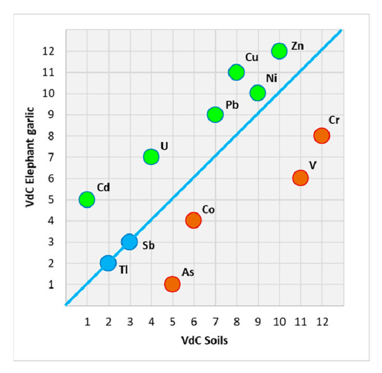 Scatterplot of PTE concentration ranks in elephant garlic vs. soil from the Valdichiana area. Elements in green are preferentially accumulated in elephant garlic; elements in red are found preferentially in the soil.