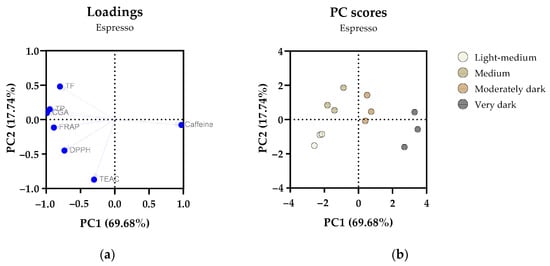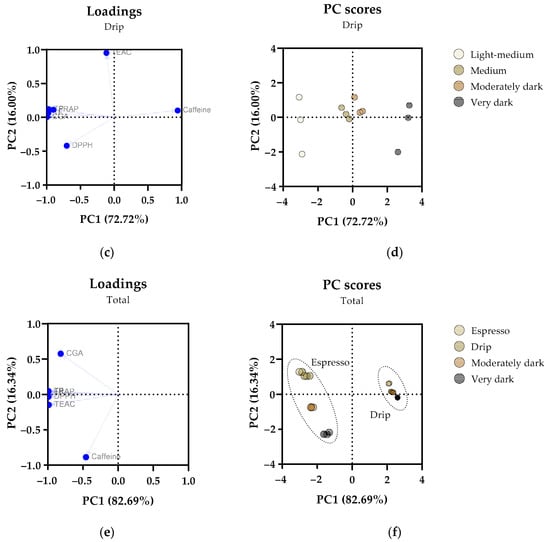 PCA was performed using the contents of TP, TF, CGA, and caffeine, DPPH radical scavenging activity, FRAP, and TEAC as variables (Figure 1). The first two principal components (PC) described 87.43% of the cumulative percentage of the total variation in espresso. The PC1 explained 69.68% of the total variance of the results. Variables including TP, TF, CGA, FRAP, and DPPH radical scavenging activity were highly negatively correlated with the PC1, but the caffeine had a strong positive correlation with this component. The PC2 accounted for 17.74% of the total variance and mainly accounted for the TEAC. In the drip, PCA showed an overall variation of 88.72%, explained by PC1 (72.72%) and PC2 (16.00%). Like the expresso, TP, TF, CGA, FRAP, and DPPH radical scavenging activity were highly negatively correlated with the PC1, and the caffeine had a strong positive correlation with this component. In both extracts, FRAP showed a close association with the PC1 compared to other antioxidant assays such as DPPH radical scavenging activity and TEAC. The DPPH radical scavenging activity and TEAC measure the relative antioxidant power of scavenging radicals [], while the FRAP analyzes the antioxidant activity through electron-donating ability []. When PCA was performed in all extracts, TP, TF, CGA, FRAP, and DPPH radical scavenging activity were located close to each other in the same direction and had a strong negative loading on PC1. CGA and caffeine strongly correlated with PC1; however, CGA had a positive loading on PC2, whereas caffeine showed a negative loading on PC2. The calculated score plots show the position of the investigated samples in a multivariate space consisted of the two PCs. It illustrates that calculated scores categorized coffee extracts in four types based on the roasting degree. In the Espresso, PC1 separated the Very dark, Moderately Dark, and Light-medium/Medium while, in the drip, PC1 separated the Very dark, Moderately Dark, Medium, and Light-medium, with almost all parameters (except TEAC) contributing for explained variance. It appears that PC2 separated Light-medium and Medium, with TEAC in espresso, but not in the drip coffee. From the PC scores of total extracts, it was estimated that higher values of CGA and lower caffeine values on PC2 correspond to lower roasting degrees. However, unlike the PCA results in the espresso and drip, other parameters did not sufficiently distinguish the coffee extracts with different roasting degrees.
