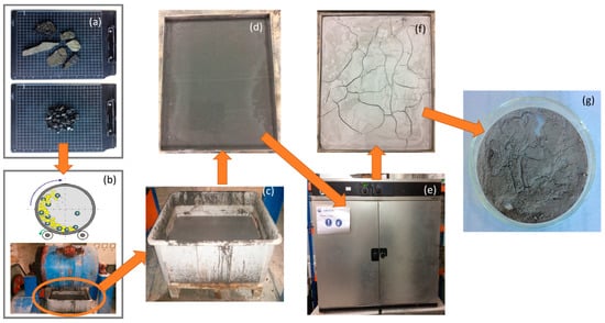 Once it was verified that the use of the cupola slag does not suppose any potential risk, cupola slag filler (CSF) was obtained from cupola slag aggregates (CSA). The process of obtaining CSF consists of 7 phases, and images of the complete reduction process can be seen in Figure 1.