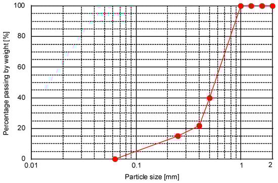 The aggregates used in the tests in this study are fine aggregates: silica sands with a density of 2650 kg/m3. The characterisation of the aggregates used for the manufacture of the mortars is carried out by considering the macroscopic characteristics, thus carrying out the geometric and dimensional characterisation; specifically, the grading curve of the sand used was determined, see Figure 2, on the basis of the EN 933-1 standard []. The procedure starts by selecting a sample of material, which is introduced into the oven until it reaches a constant weight. Once the sample is completely dry, it is sieved and each of the fractions obtained is weighed.