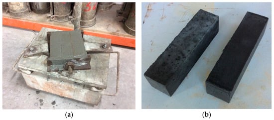 The manufacturing process of the mortars was as defined by EN-196-1 [], see Figure 3a. Twenty-four hours after the mortars were manufactured, they were demoulded and placed in a humidity chamber for curing, Figure 3b.
