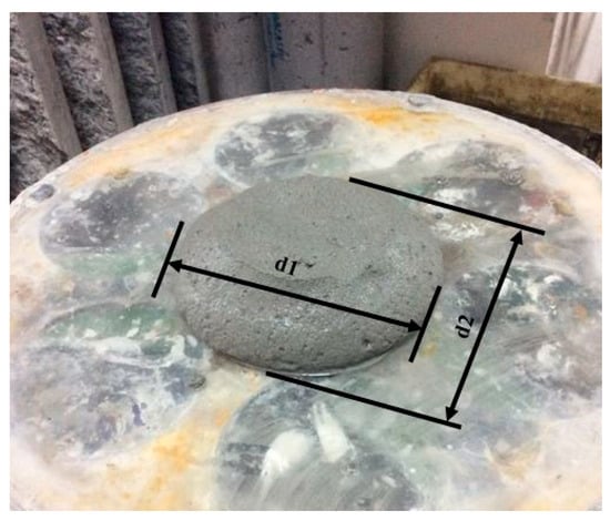 For the determination of the consistency of the mortars, the procedure according to EN 1015-3—Methods of test for mortar for masonry—Part 3: Determination of consistency of fresh mortar (by flow table) [] is followed. Very similar to that used to determine the consistency of concrete by means of a shaking table. In the case of concrete [], there is a limitation regarding the maximum size of the aggregate of 64 mm. In the case of mortar, the limitation is 4 mm. In both tests, the fresh cone is shaken 15 times to finally measure the diameter in two perpendicular directions. Figure 4 shows an example of the parameters registered in each test (d1 and d2).
