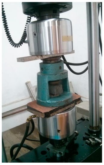 The compressive strength was determined according to EN 196-1 [] (prismatic specimens of 160 × 40 × 40 mm and at a loading rate of 50 Nm/s). An example of the compressive strength test set-up is shown in Figure 5.