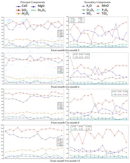 The casting process is a highly complex process involving a large number of variables. For this reason, slight variations in the chemical composition of cupola slag are expected. Therefore, a study of the evolution of the different components present in the cupola slag over time was carried out. To make this analysis easier, these components were divided into two groups according to the quantity present in each of them: main components and secondary components, see Figure 8. In this figure, the Y-axes indicate the quantity of each component, see legend. For the X-axis, this is a linear scale of the time indicated at the bottom of the figure.