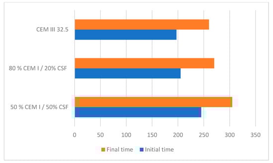 Figure 9 shows a graph comparing the initial and final setting time values for the reference cement (CEM III 32.5), for a cement consisting of 80% CEM I + 20% CSF and for another cement consisting of 50% CEM I + 50% CSF.
