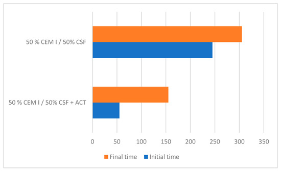 Based on the results shown in Figure 9, it can be concluded that increasing the percentage replacement of CEM I with CSF delays both the start and end of the setting. To ensure that the cement with 50% CEM I + 50% CSF could be used for silver application, it was decided to use the same type of cement, but with a setting activator (Na2O), see Figure 10.