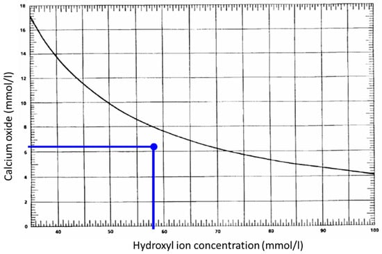 Representing the concentrations of hydroxyl ions and calcium hydroxide measured in the solution on the graph provided by standard EN-196-5, the point shown in Figure 12 is obtained. This point represents the saturation concentration in calcium oxide of the solution as a function of the concentration of hydroxyl ions at 40 °C. According to the aforementioned standard, the cement complies with the pozzolanicity test when the point obtained is below the saturation concentration curve in calcium oxide. This is the case of the test carried out, which yielded values of [CaO] = 6.4 and [OH] = 58.0, which allows us to state that the slag analysed complies with the pozzolanicity test.