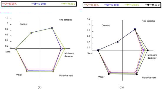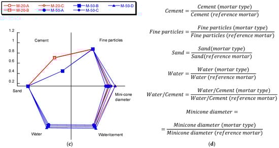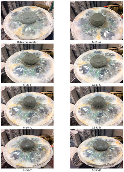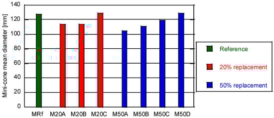 In order to make the results of the different replacement percentages comparable, it was decided to use mortars with equivalent workability. For this reason, based on the results shown in Figure 13 and Figure 14, M-20-C and M-50-D were selected as comparable mixes to the reference mix.