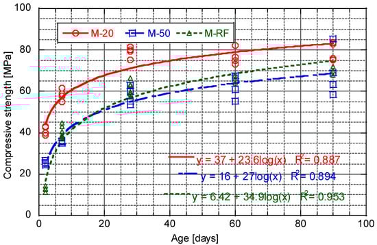 From analysing Figure 16 it is possible to see how the fit to a logarithmic function is better for early ages, especially in the case of having an M-20 and CEM III. This effect can be justified because the mortar has reached its maximum strength values and does not continue to evolve. This may be because OPC at 28 days has almost completely reacted, which is why the mechanical properties of those mortars with CEM I practically do not evolve beyond 28 days.
