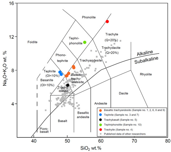 Figure 2. SiO2 vs. K2O + Na2O classification (TAS) diagram of late Cenozoic volcanic rocks on Jeju Island [37]. Published data of other researchers are from Kim et al. (2019) and Brenna et al. (2012b) [21,28].