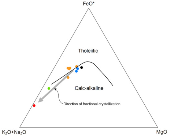 Figure 3. AFM diagram of late Cenozoic volcanic rocks on Jeju Island, including the boundary between the calc-alkaline and the tholeiitic fields (after Irvine and Baragar, 1971) [38]. Symbols are the same as in Figure 2. FeO* is total iron as FeO assuming Fe2+/Fetotal = 0.9.