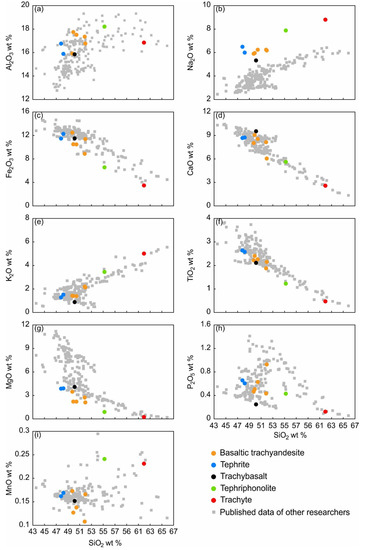 Figure 4. Variations in major oxide contents vs. SiO2 content of the volcanic rock samples from Jeju Island, Al2O3 vs. SiO2 (a), Na2O vs. SiO2 (b), Fe2O3total vs. SiO2 (c), CaO vs. SiO2 (d), K2O vs. SiO2 (e), TiO2 vs. SiO2 (f), MgO vs. SiO2 (g), P2O5 vs. SiO2 (h) and MnO vs. SiO2 (i). Published data of other researchers are from Kim et al. (2019) and Brenna et al. (2012b) [21,28].