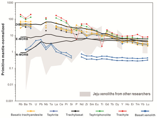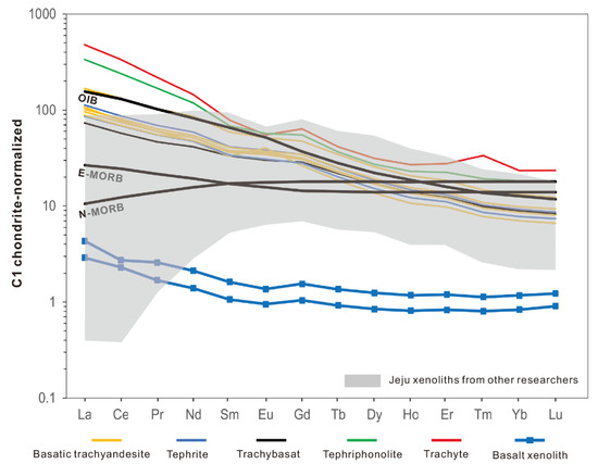 Figure 5. C1-chondrite-normalized [39] rare-earth-element patterns of alkaline volcanic rock and mantle xenolith samples from Jeju Island. The E-MORB, N-MORB, and OIB data are from Sun and McDonough (1989) [39]. The compiled xenolith data are from Yang et al., 2012a; Yang et al., 2012b; Woo et al., 2014 and Choi et al., 2005 [11,12,13,34].