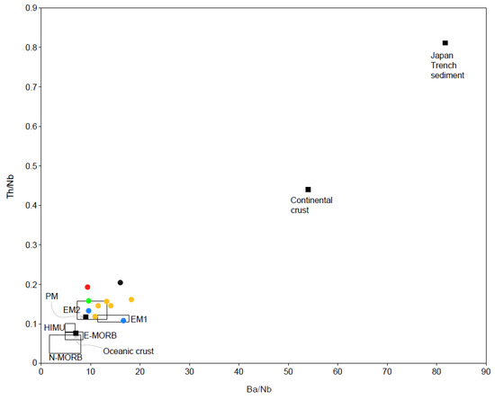 Figure 7. Ba/Nb vs. Th/Nb ratios. The data for the primitive mantle (PM), E-MORB, N-MORB, HIMU, EM1, EM2, and continental crust (CC) are from compilations by Saunders et al. (1988), Weaver (1991a), Plank and Langmuir (1998), and White et al. (2014) [40,41,42,43]. Symbols are the same as in Figure 2.