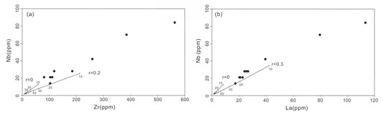 In Figure 8, Zr, Nb, and La values are plotted for r = 0.2 (Zr vs. Nb) and r = 0.3 (La vs. Nb). The partition coefficients of Zr, Nb, and La are referred from Zanetti et al. (2004), McKenzie and O’Nions (1991), Villemant (1988), Foley et al.(1996), Rollinson (1993), and Zack and Brumm (1998) [49,50,51,52,53,54]. The CA values of Zr, Nb, and La of the lower continental crust are referred from Taylor and McLennan (1995) [55].