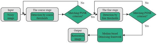For the ROR algorithm, the operation was carried out in two stages—i.e., detection followed by filtering. For detection, first the ROR was measured to find the impulse of each pixel; then, all the pixels were divided into four levels according to their ROR values. Second, different decision rules were used to detect the impulse noise based on the absolute deviation from the median in each cluster. In order to make the detection results more accurate and robust, the from-coarse-to-fine strategy and the iterative framework were used for filtering. The structural flowchart of ROR is shown in Figure 1.