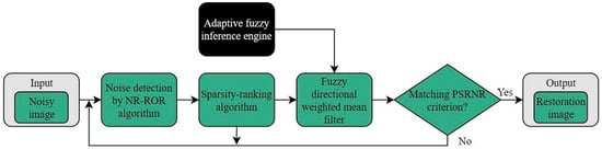The proposed AFWMF model can be divided into three stages. The first stage is the proposed detection method, which combines ROR and fuzzy rules to build a corresponding tag matrix. In the second stage, we use a filter order method called sparsity ranking [27]; its main idea and process have been discussed in the previous section. The last stage uses fuzzy rules to filter corrupted pixels according to a tag matrix from the first part, while the filtering order is from the second part. Figure 2 represents the system flowchart of the proposed model, and its key concepts and algorithm of main components are described in the next three subsections.