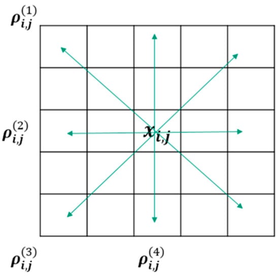 ρ i , j ( 1 ) = { x i 2 , j 2 , x i 1 , j 1 , x i , j , x i + 1 , j + 1 , x i + 2 , j + 2 } , ρ i , j ( 2 ) = { x i , j 2 , x i , j 1 , x i , j , x i , j + 1 , x i , j + 2 } , ρ i , j ( 3 ) = { x i + 2 , j 2 , x i + 1 , j 1 , x i , j , x i 1 , j + 1 , x i 2 , j + 2 } , ρ i , j ( 4 ) = { x i 2 , j , x i 1 , j , x i , j , x i + 1 , j , x i + 2 , j } .