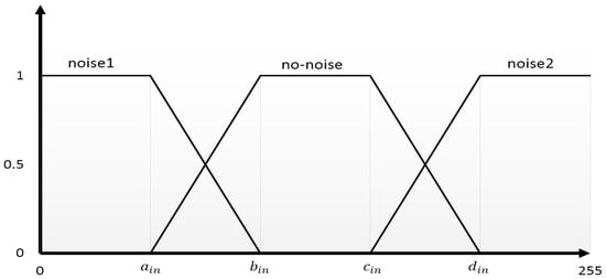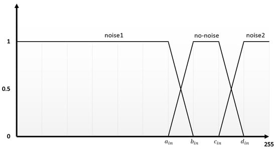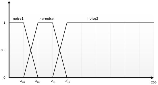 Afterwards, we form membership functions. There are three membership functions corresponding to three input fuzzy sets; they are nosie1, no-noise, and noise2, respectively, and are pictured in Figure 4. In Figure 4, the horizontal axis is a pixel value. On the vertical axis, the grade of membership of the element x in the fuzzy set is shown, with values ranging from 0 to 1. These three membership functions are three input fuzzy sets. They are formatted as Equations (12)–(14) below, respectively.