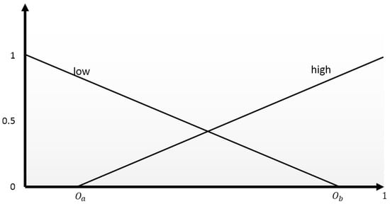 In Figure 5, the horizontal axis is the importance value, and it ranges from 0 to 1. On the vertical axis, we have the membership function of a fuzzy set denoted by x, and this axis has values from 0 to 1. These two membership functions are output fuzzy sets. They are defined as Equations (15) and (16) below, respectively.