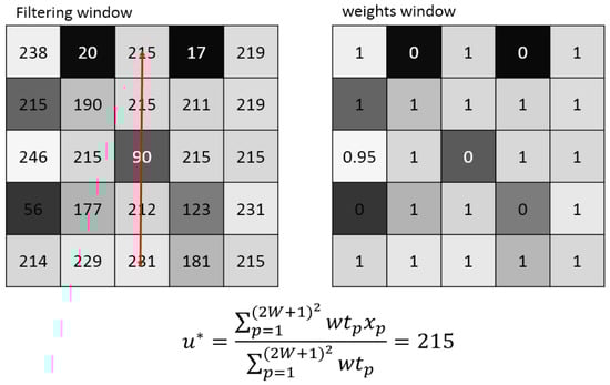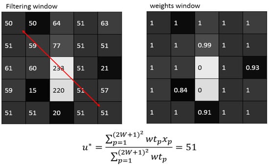 For handling our proposed method, a filtering window and a tag window were defined as follows. A matrix X with the size (R × C ) was built for the input image. The filtering window was a square matrix. It had odd ( 2 W + 1 ) × ( 2 W + 1 ) dimensions. It is represented as follows: