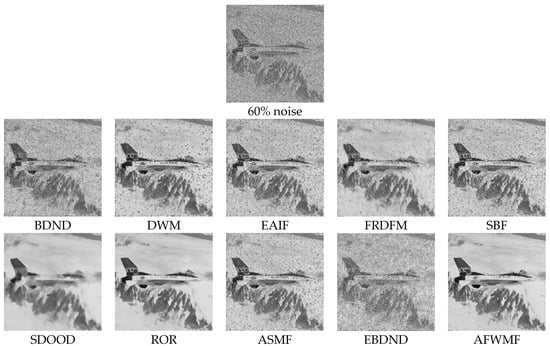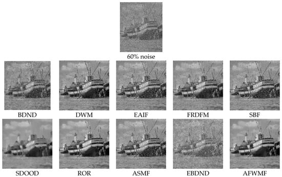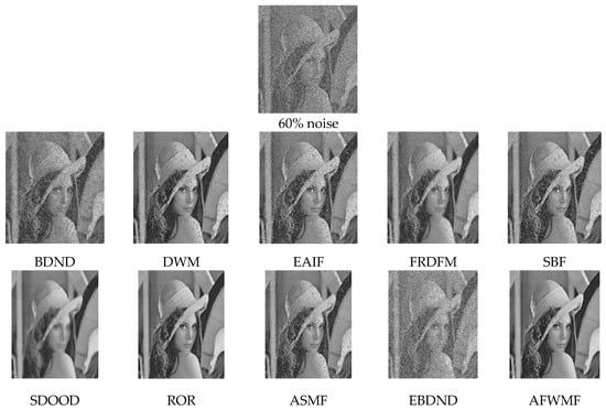For every pixel in the image, we found its ROR; if it ranged in fourth level, as shown in Table 1, then that pixel was noise-free. We set the tag to 1, or else found the relative divergence d among the filtering window’s median and active pixel. Then, based on the ROR value of d, we compared it to T f k . We checked whether it was noisy or noise-free. We checked if d was bigger than T f k . According to the r, we updated the tag matrix. Similarly, we calculated the values for all the pixels.