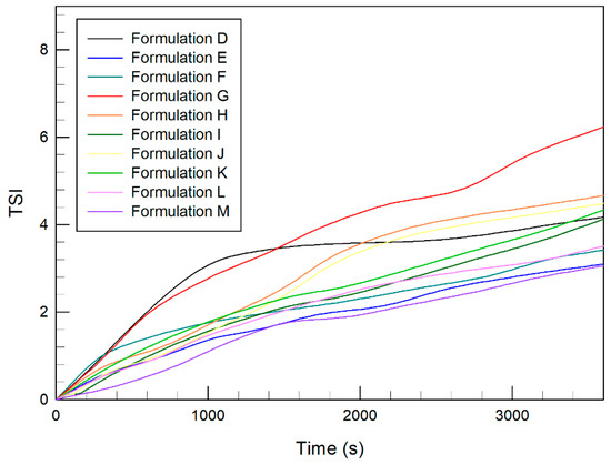 In fact, the values needed to avoid destabilizing phenomena are questioned due to the great influence of several other parameters to be considered, such as the solvent used, the concentration of ions, and functional groups of the surface [40]. For this reason, further stability studies have been performed. The stability kinetics profiles of all cationic ethosomes (formulations D-M) were investigated using Turbiscan Lab analysis and the results were compared. As can be seen in Figure 2, the addition of different amounts of DOTAP did not result in a marked variation of TSI values compared to those recorded for formulation D, which also reported ΔT and ΔBS profiles within an excellent stability range (Figure 2). These results suggested that no relevant instability phenomena were to be expected for the analyzed samples.