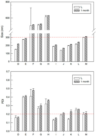 As can be seen in Figure 3, formulations D, E, I, J, K, and L retained sizes lower than 300 nm after 1 month of incubation. Between them, formulation D and formulation I also reported the best values of polydispersity (lower than 0.2) after 1 month of incubation.