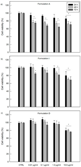 Evaluation of cytotoxicity of ethosomal systems on NCTC-2544 cells through MTT test after 24 h, 48 h and 72 h of treatment. Conventional ethosomes, formulation A (a), ethosomes made of PL90G:DOTAP 10:0.5 molar ratio, formulation I (b) and ethosomes PL90G:DOTAP 10:1 molar ratio, formulation D (c) have been used for this study. Results are expressed as the mean value of three different experiments ± standard deviation. * p value < 0.05 with respect to control (untreated cells).